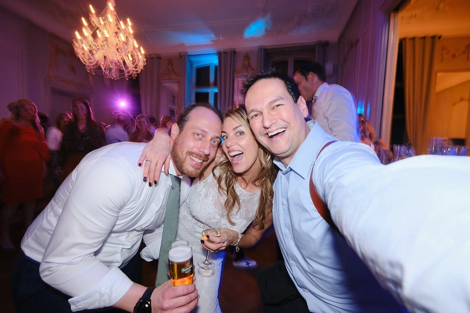 Het bruidsfeest is het moment dat iedereen zichzelf is. Ik meng mij tussen de gasten, dans soms mee, en vang de echte sfeer — zonder dat iemand het doorheeft dat er een fotograaf rondloopt.