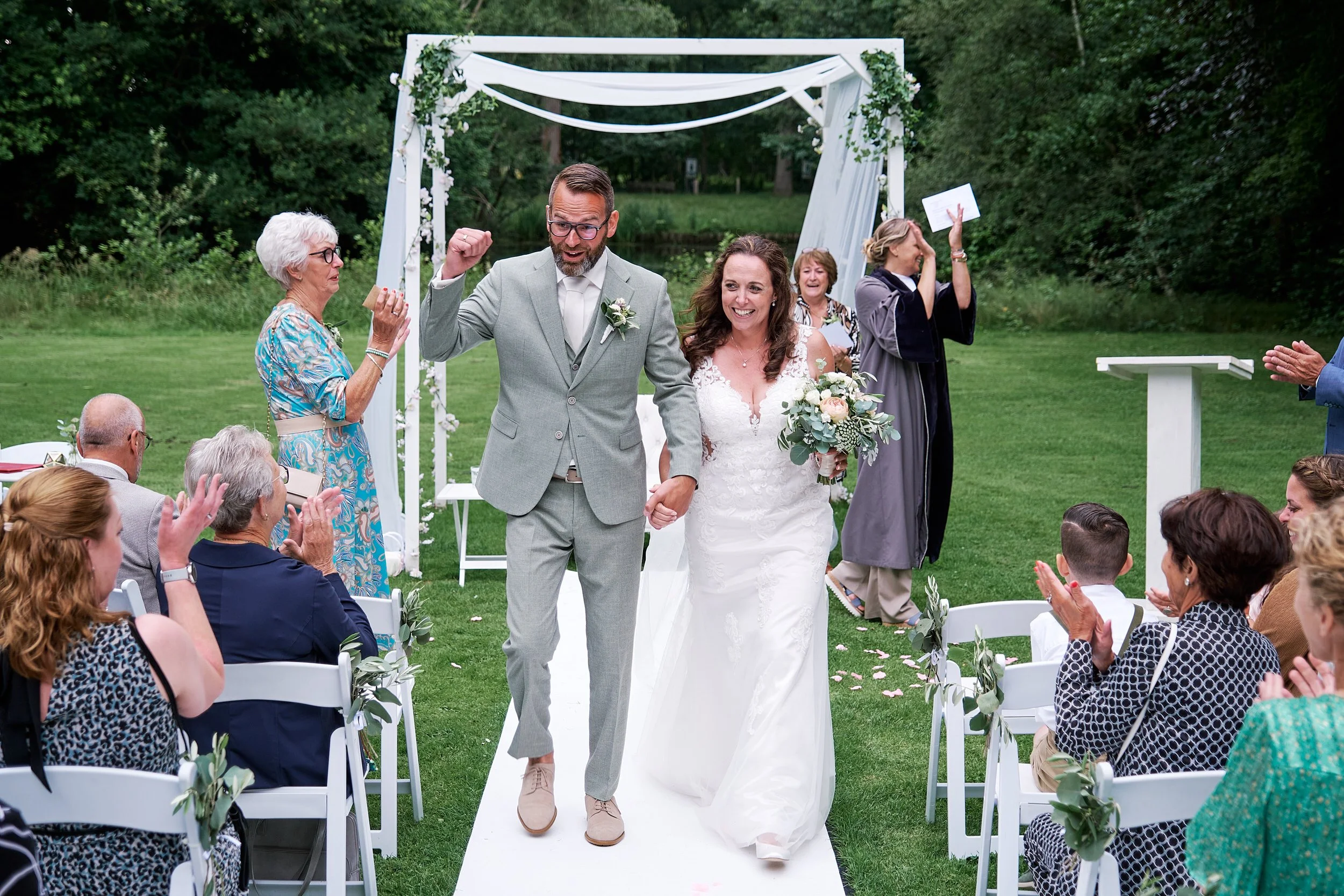 De ceremonie is het hart van de dag. Ik fotografeer niet alleen jullie — ik fotografeer iedereen. De tranen van de moeder van de bruid. De grijns van de getuige. Het kind dat stiekem de bloemen plukt.