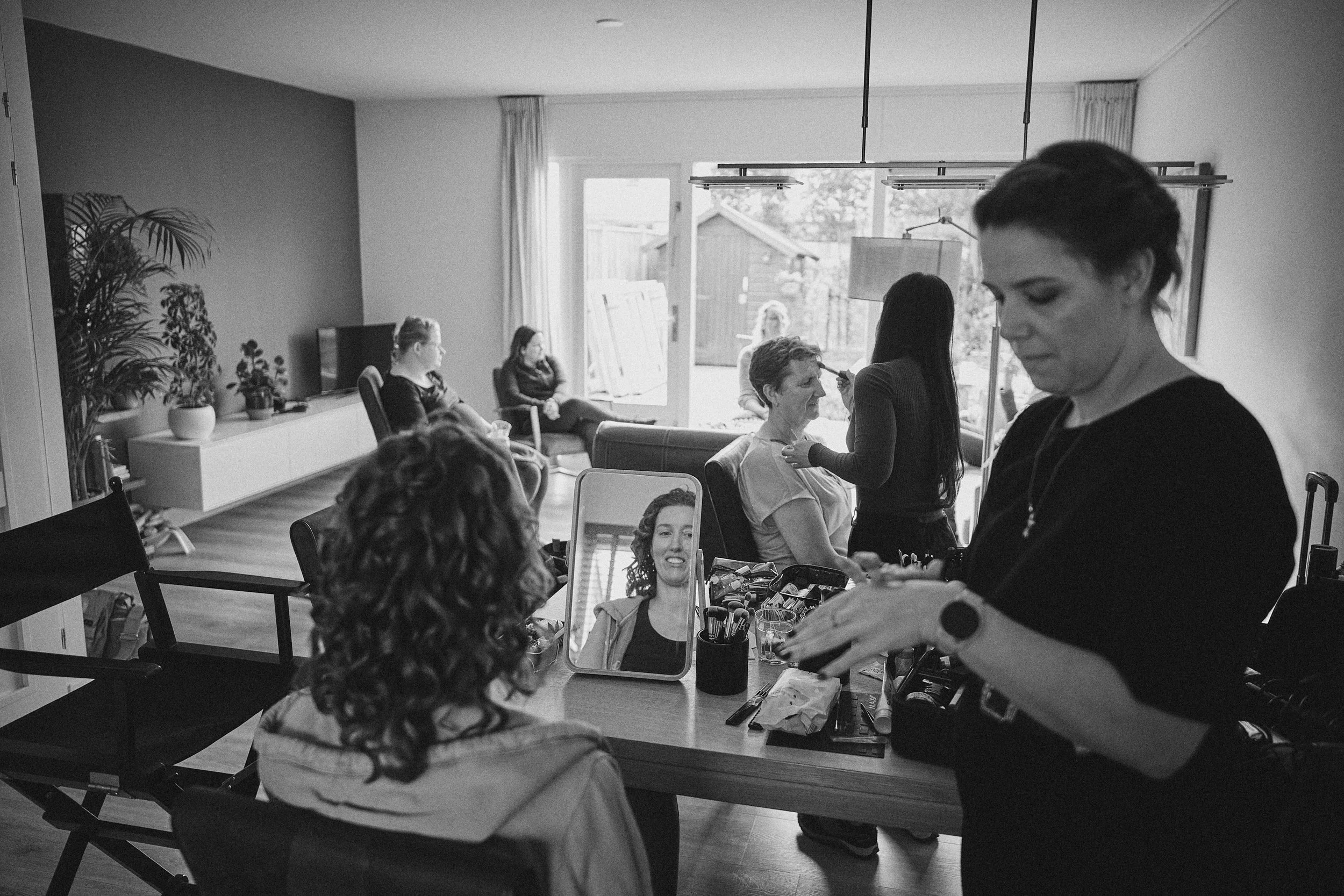 De ochtend begint altijd met spanning. Het aankleden, de eerste blik in de spiegel, de reacties van de mensen die er het meest toe doen. Dit zijn de meest intieme trouwfoto's van de dag — en vaak de meest ontroerende.